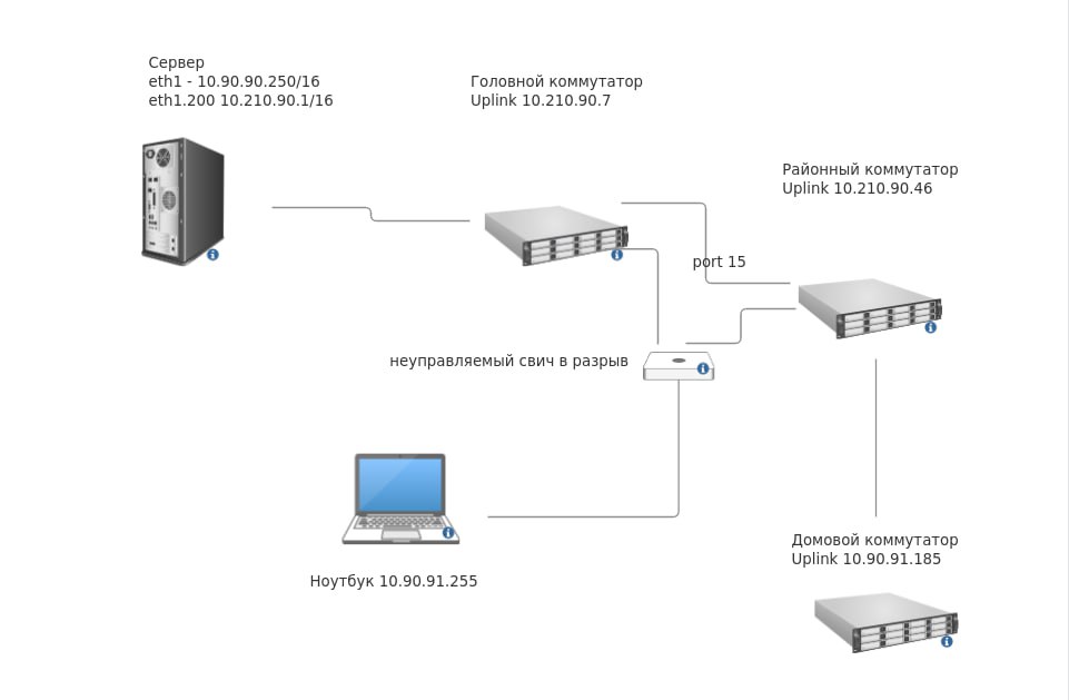 Добрый день, столкнулись с проблемой, может кто то подскажет. Есть сервер для впн с интерфейсами eth1 10.90.90.250/16 и eth1.200 10.210.90.1/16 мы на него коннектимся чтобы потом через тоннель заходить на веб морды коммутаторов, но некоторые коммутаторы таким образом недоступны. Вот допустим у нас идет 200ый влан 3420-28 головной, затем по этому же влану 1228/me районный и за ним уже домовая пятерка в дефолтнойм влане 10.90.91.185? на эту пятерку (dgs-1100-05) удается зайти если встать в разрыв, вставить в головной коммутатор неуправляемый свич и в этот свич уже районный коммутатор и ноутбук в дефолтной сети. Пробовал проверить пинги, что с районного что с головного не идут. Приложу небольшую схему потому что текстом понять сложновато, может кто подскажет в чем может быть проблемма?