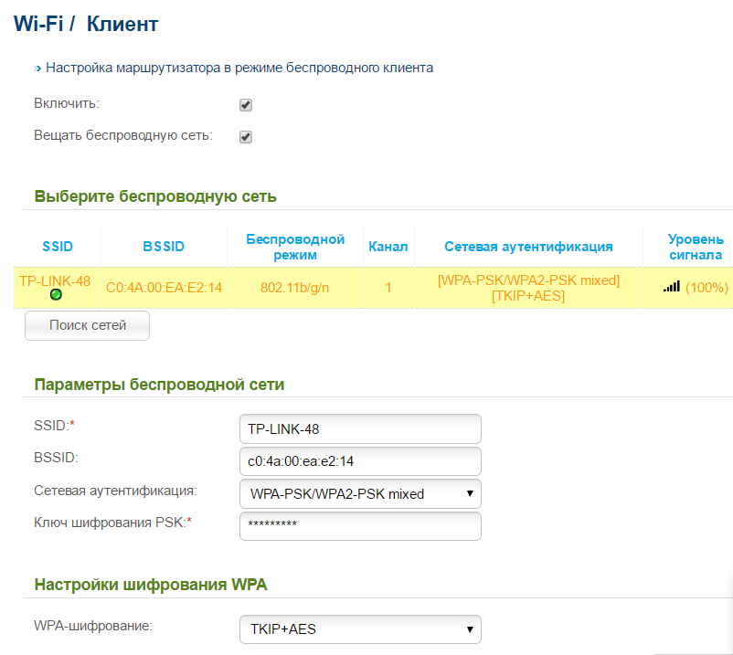 4- Настраиваем wifi-> клиент-> подключаемся к wi fi сети тп-линка (канал, тип шифрование- все верно)
