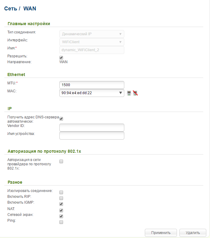 5- создаем wan соединение-> тип соединения - динамический ip, порт - WifiClient (остальные настройки по умолчанию)
