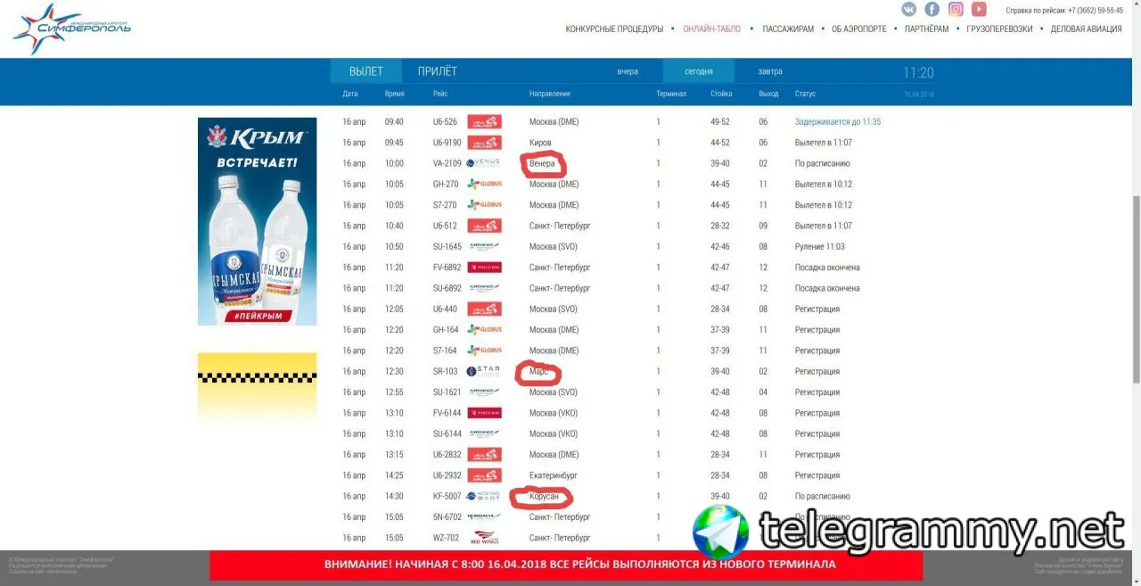В понедельник в онлайн-табло международного аэропорта в Симферополе обнаружились в очереди на вылет рейсы на другие планеты.