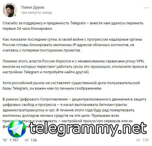 Дуров благодарит за поддержку Телеграма