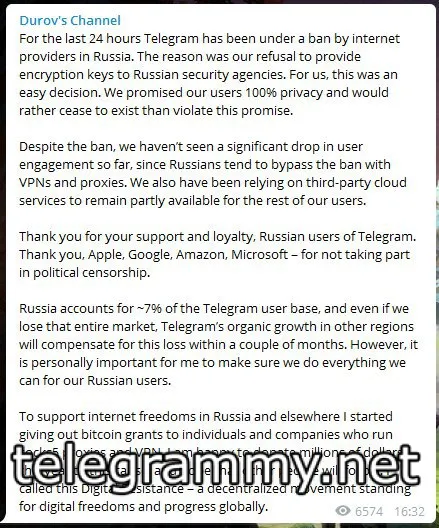 Здесь он благодарит Apple, Google, Amazon и Microsoft, за то, что не пошли на поводу у РКН и послали нахуй эту помойку.