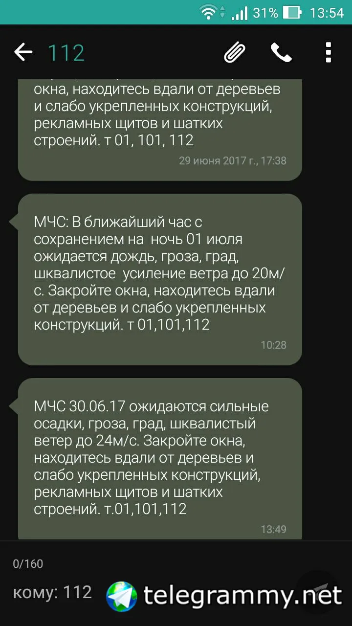 МЧС: 30 июня ожидается дождь, местами сильный, гроза, град, порывы ветра до 20 м/с. Закройте окна, находитесь вдали от деревьев и слабо укрепленных конструкций, рекламных щитов и шатких строений. т 01, 101, 112