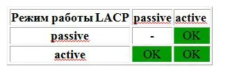 • Работа протокола LACP будет возможна, при следующих конфигурациях сторон: