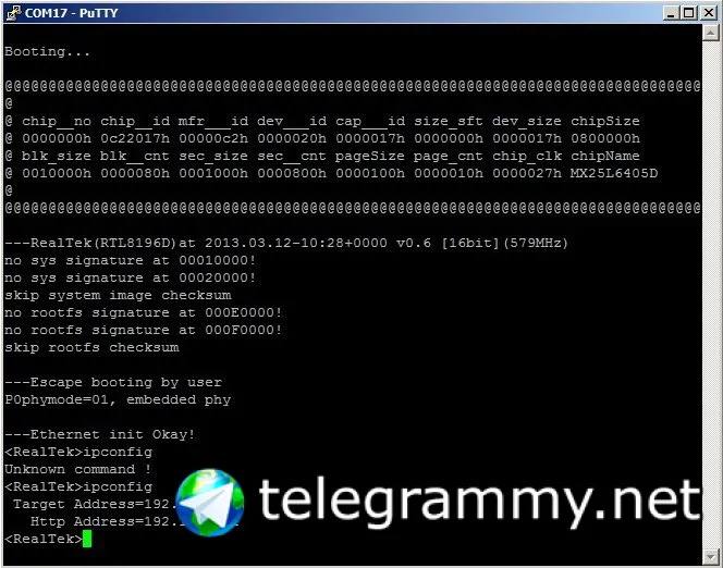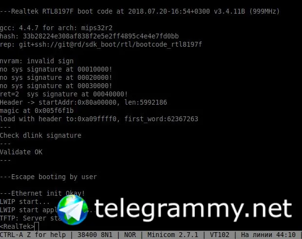 видимо, при стандарной загрузке в терминале постоянная загрузка (no sys, rootfs signature и т.п.). При загрузке в режиме восстановления появляется консоль <RealTek>
