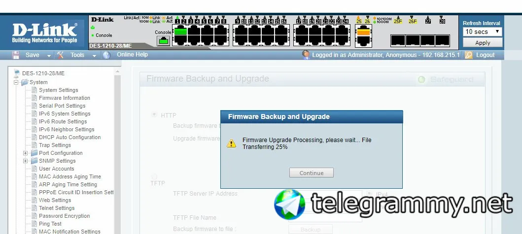 DES-1210-28/ME:5# config ipif System ipaddress 192.168.215.2/24 gateway 192.168.215.1