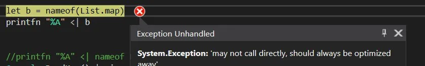 let inline nameof (_: 'T) : string = raise (Exception "may not call directly, should always be optimized away")