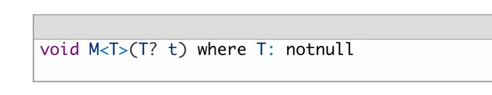 "Because of this issue between the concrete representations of nullable reference types and nullable value types, any use of T? must also require you to constrain the T to be either class or struct."