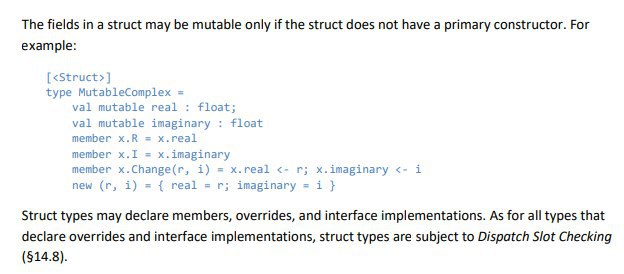 The fields in a struct may be mutable only if the struct does not have a primary constructor. For