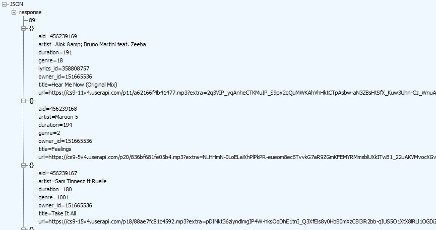 {"response":[89,{"aid":456239169,"owner_id":151665536,"artist":"Alok & Bruno Martini feat. Zeeba","title":"Hear Me Now (Original Mix)","duration":191,"url":"https:\/\/cs9-11v4.userapi.com\/p11\/a62166f4b41477.mp3?extra=2q3VIP_yqAnheCTKMuIP_S9px2qQuMWKAhVhHktCTpAsbw-aN3ZBsHlUfX_Kuw3Uhn-Cz_WnuAn3WgDavjdg6awfi5TqF0akkuQynDetuo2Qvx5t8yNm1VlHOnNbvUjGT53JgqUdjSCKwQ","lyrics_id":358808757,"genre":18},{"aid":456239168,"owner_id":151665536,"artist":"Maroon 5","title":"Feelings","duration":194,"url":"https:\/\/cs9-5v4.userapi.com\/p20\/836bf681fe05b4.mp3?extra=NLHHmN-0LoELaiXhPlPkPR-eueom8ec6TvvkG7aR9ZGmKFEMYRMmsbtSXkITwB1_22uAKVMvocXGvNXajEf_IS21LYkS4xApAvyeDVexZNcf7392aRXHHQQY9dbNSpgHt7ZCTBsjXChlVA","genre":2},{"aid":456239167,"owner_id":151665536,"artist":"Sam Tinnesz ft Ruelle","title":"Take It All","duration":180,"url":"https:\/\/cs9-15v4.userapi.com\/p18\/88ae7fc81c4592.mp3?extra=pDINkt36ziyndlmgIP4W-hksOoDhE1tnI_Q3XfEls8y0HbB0mXzCBl_jR2bb-qIUS5O1XtX8lRLl1OGDiZX47-vQclDypbWMDAwrliumMwtvAtdyaCT4L-KWRBKXQI9dVdRgCnS_HZ9ndw","genre":1001}]}