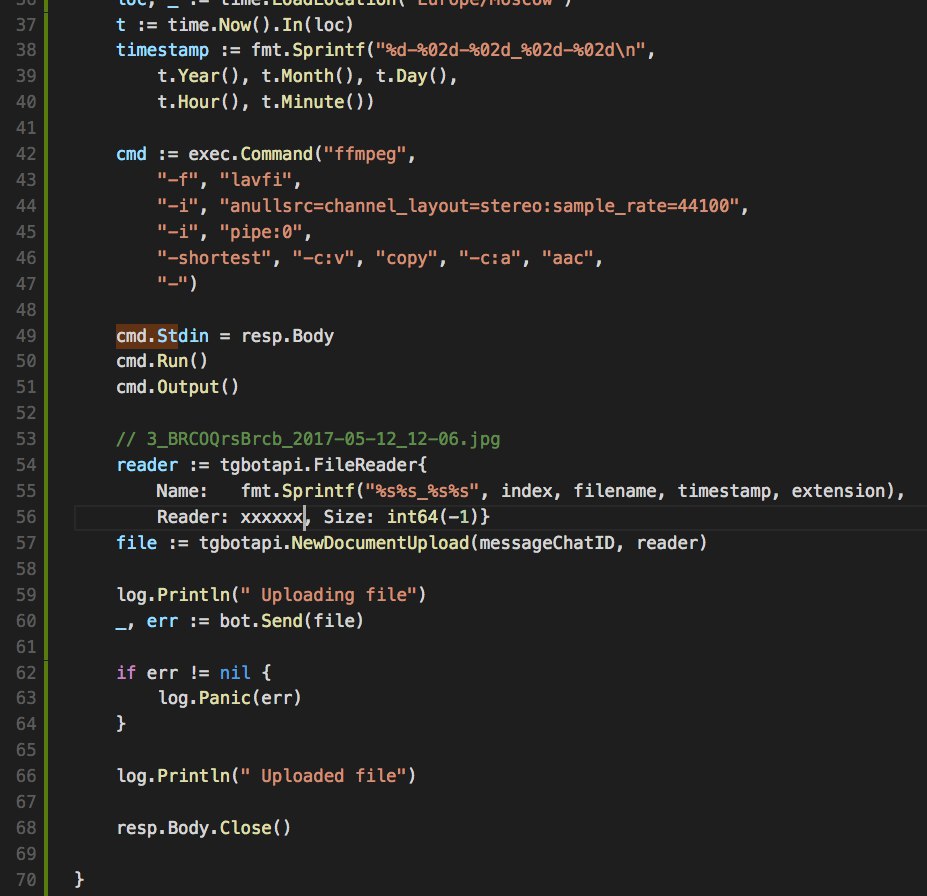 ну, я не вдавался в подробности, но, думаю, горутина, которая занимается транскодингом может получать pipe, писать в pipewriter, а другая горутина pipereader отправить в telegramapi