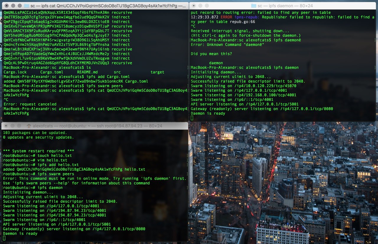 запустил ipfs daemon на своем компустире и сделала ipfs add file.txt