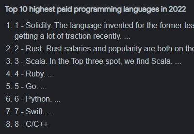 Чет вот я открыл гугл, и по запросу "top salary programming languages 2022" он в каждом топе, в некоторых его даже на 1 место ставят. Странно, не правда ли?