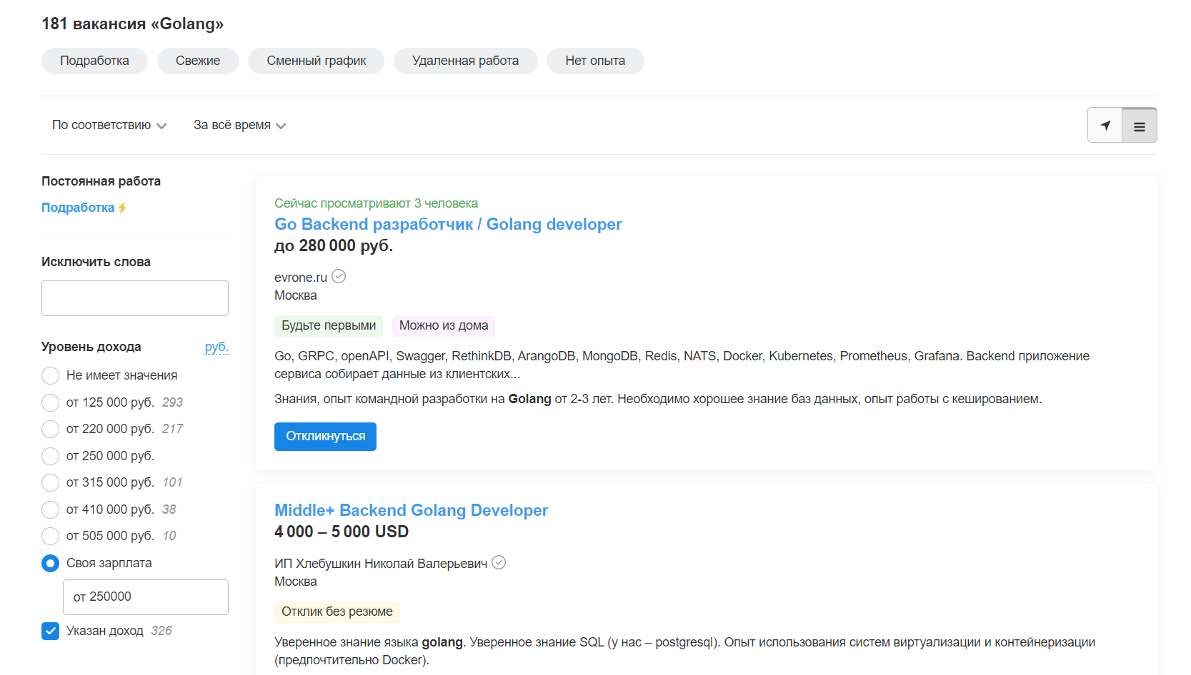 прямо сейчас на хх почти 200 вакансий, в которых в вилке указано от 250. и еще немеряное количество, в которых не указано