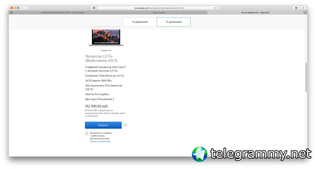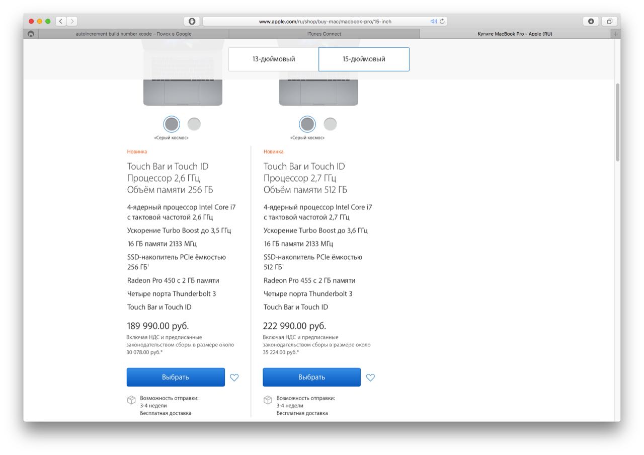 — 15-дюймовый MacBook Pro с сенсорной панелью Touch Bar и датчиком Touch ID от 189 990 рублей.