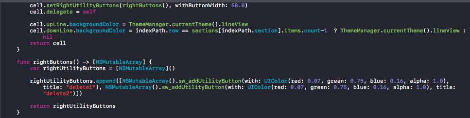 Всем привет. Я использую библиотеку https://github.com/CEWendel/SWTableViewCell , но заюзать ее хочу в swift. Я добавляю кнопки (фото) и он мне выдает ошибку -[__NSArrayM superview]: unrecognized selector sent to instance 0x61000025f200
