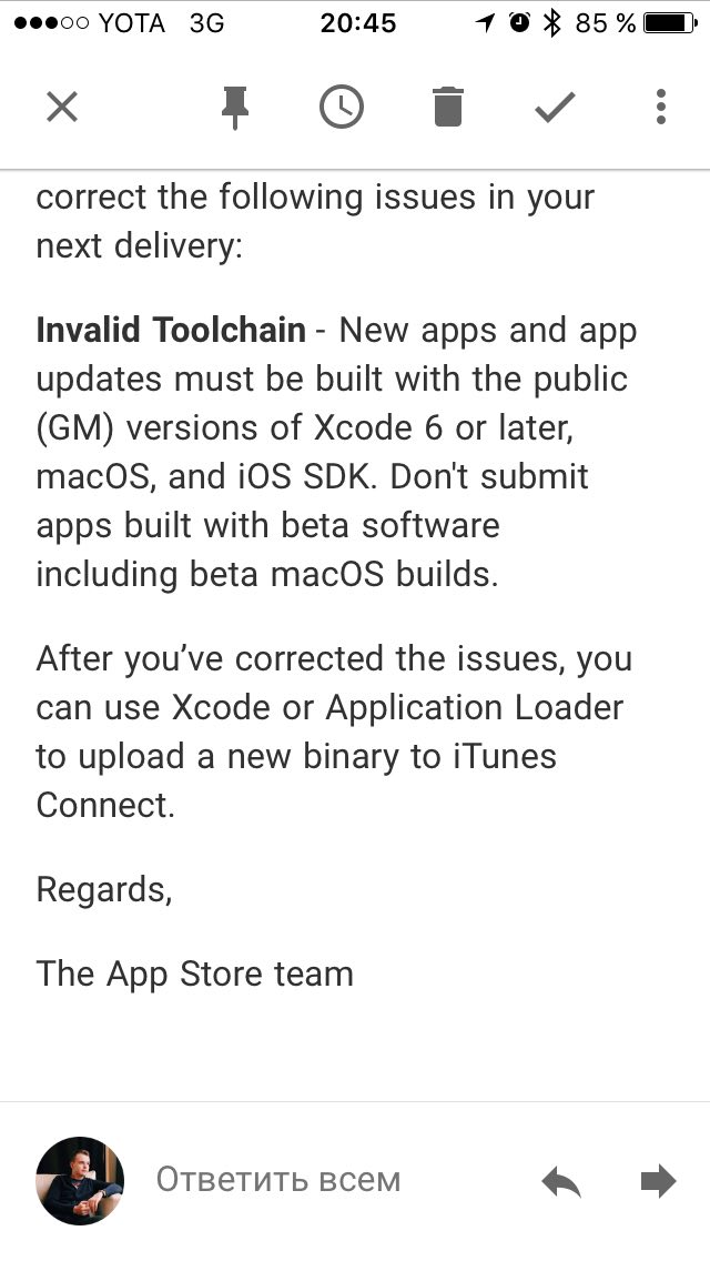 Ребят, а как такая хрень при публикации возникла? Инфа 100, что я лил не с бета версии Xcode а с релизной с AppStore.