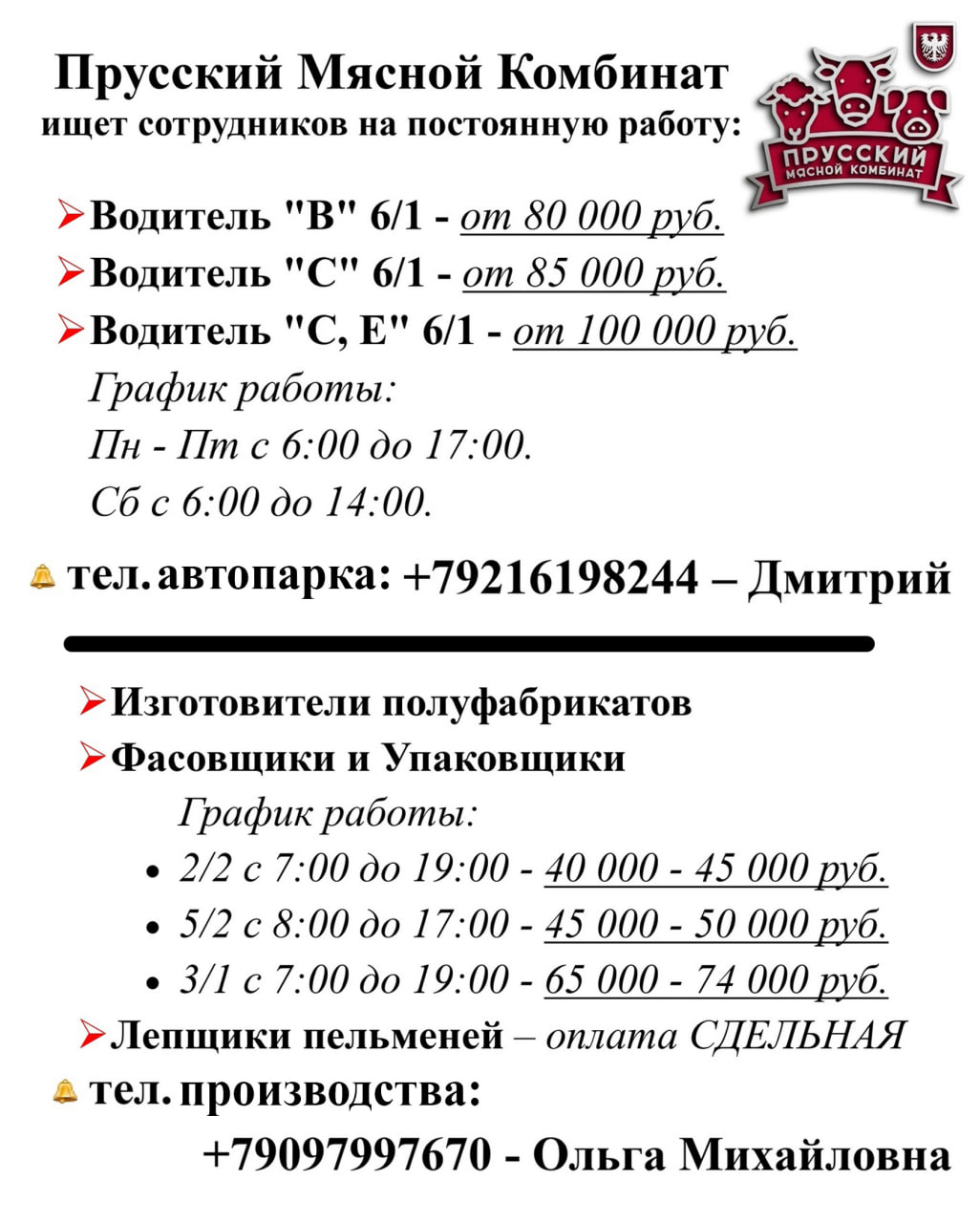 Нужны разнорабочие срочно мужчины и женщины 18+. Два объекта п. Космодемьянского и г. Гурьевск. Работаем на упаковке пищевой продукции в производственном помещении. Мед. книжку в процессе работы оформим за счёт организации. Оплата от 2400р до 3920р.(На карту ежедневно сразу в конце смены) Смены от 10 до 14 часов. График с 8:00 до 19:00 либо с 8:00 до 22:00(Час обед). Общий сбор в 7:00 на парковке Дома Советов(Шевченко 2), будет несколько микроавтобусов. С собой сменку(В цеху +8),кофту,штаны,ботинки либо галоши,либо сапоги,обед и паспорт. Читайте пожалуйста внимательно все условия и звоните записывайтесь. Очень большой объём работы. +79992558133, +79062160869