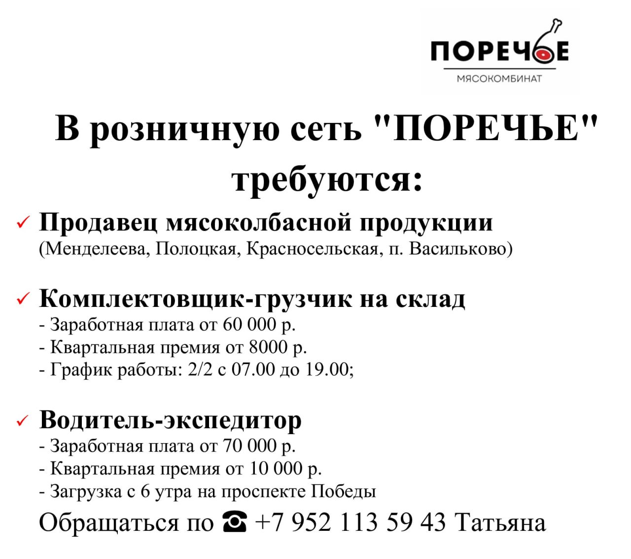По поводу вакансии обращаться по тел. 89003483114