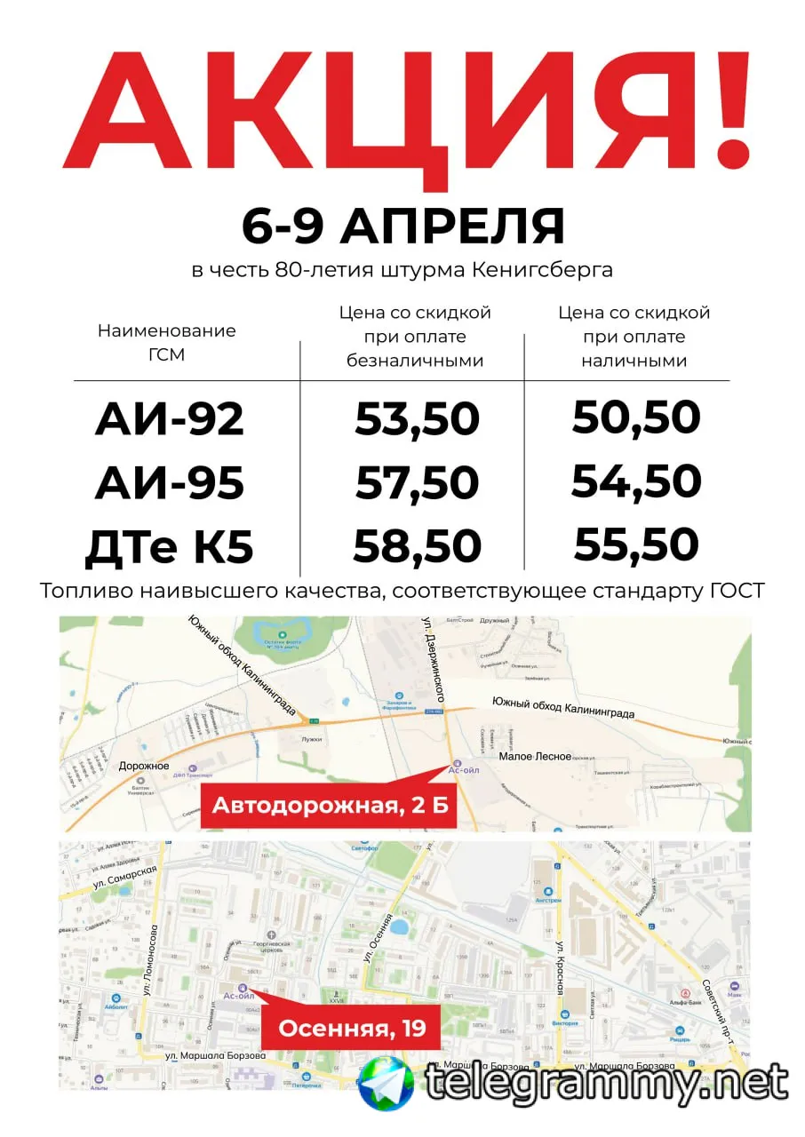 АЗС "АС-ОЙЛ" с гордостью объявляют о специальном предложении в честь 80-летия штурма Кёнигсберга! В период с 6 по 9 апреля на всех АЗС "АС-ОЙЛ" вы сможете заправиться качественным топливом по специальным ценам.