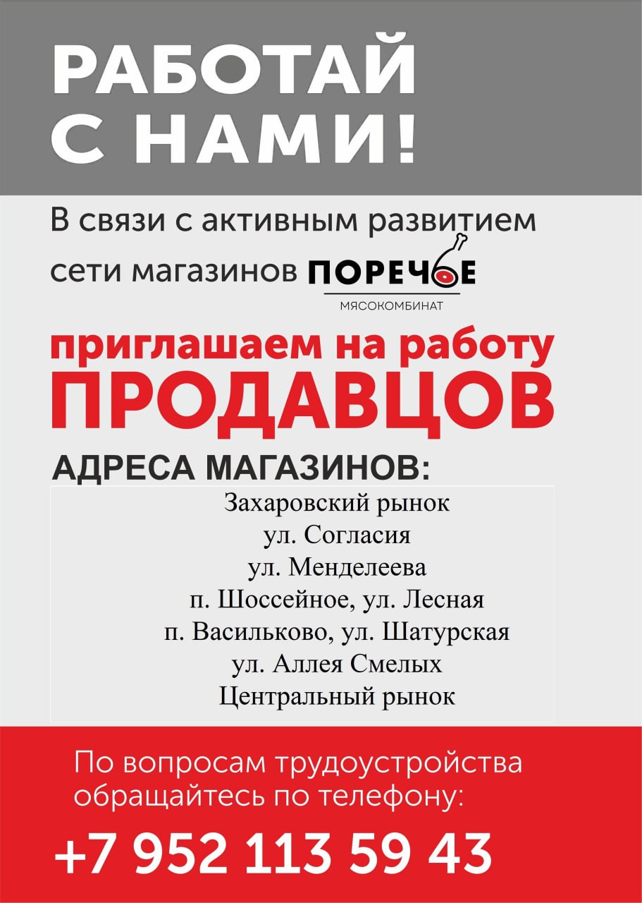 Мясному производству, находящемуся в п. Голубево, требуются разнорабочие на различные участки работы. Опыт работы желателен, но не обязателен.