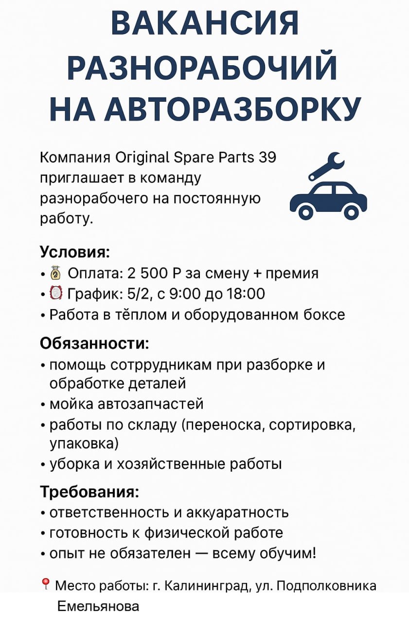 Требуются ответственные, стабильные ребята. Занимаемся благоустройством территорий в основном в Гурьевске.(тротурная плитка, дороги, озеленение) 400 р. В час. Если на машине + 500р смена. Расчеты по субботам. Пишите в ЛС о себе возраст, опыт работы.