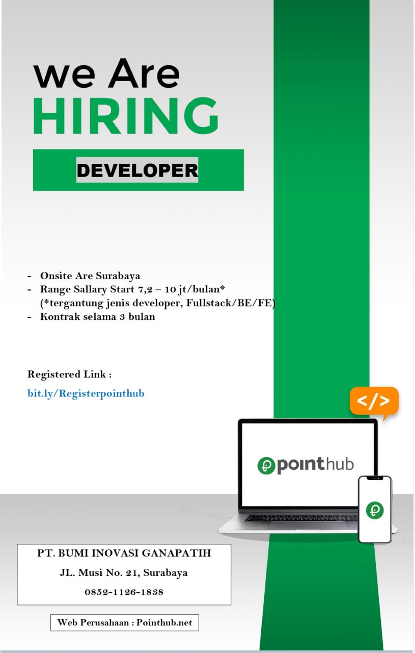 Kami dari PT. Bumi Inovasi Ganapatih (Pointhub.net) sedang membutuhkan Developer untuk :