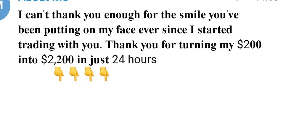 Forgive me for doing this but If I'm not talking the company legitimacy then I'm ungrateful, I only invested $1000 and cut a profit of $10,500 I was like learning to the air because it has been a long time I heard people meeting with a trustful manager like malisa I will never stop taking about your good work God blesss you always sir