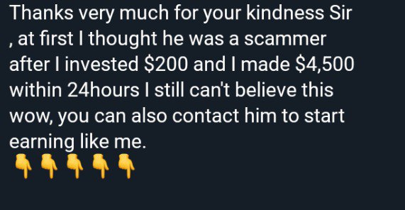 I must say I'm really making it here from this trader just with a little start up capital of $500 I have been able to get $5000 with in 3days of intensive trading with him Mr