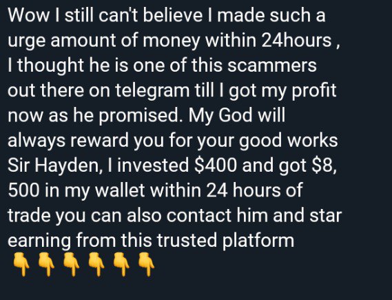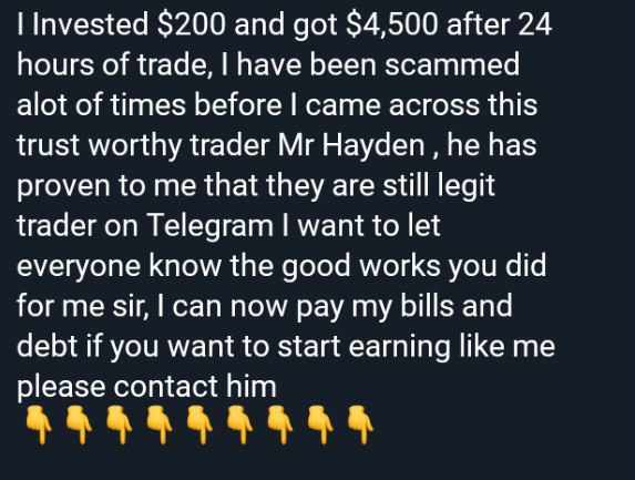 I'm impressed with the wonderful work well done. I took a risk to give a try of $300 I received a payment of $3,500 thank you so much you can also contact her for the best trading strategies via the link below Mr @Trader_Johnson04