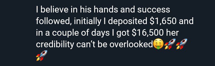 From the bottom of my heart I want to say a big thanks to you sir for you have proven to me crypto currency investment is legit with the guidelines I was able to make $9,500 within 72 hours in crypto currency investment with a little start up capital $950 you're a trustworthy man to everyone out there in search of a trader I recommend him to you all
