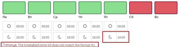 так я на фронте плагин js юзаю, он даёт выбрать 24:00, там шаг по пол часа. Но 24:00 не проходит валидацию по формату. А круглосуточность надо как то задавать