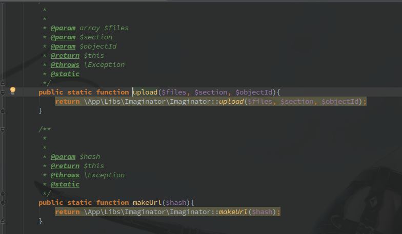 тогда автодополнение частично будет работать (потому что PHPDoc не умеет правильно описывать статические методы, а шторм не всегда корректно подхватывает их)