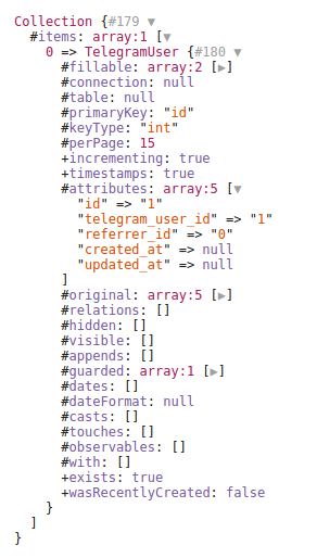 $referrer = \App\TelegramUser::find(2)->referrer()->get();