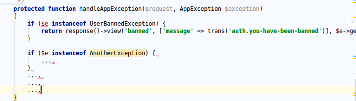 @Denormalization привет, быстренький вопрос. Подскажи шаблон, как бы украсивить этот код), всмылсе мб бинд в массиве прописать на UserBannedException::class => 'someMethod', ...