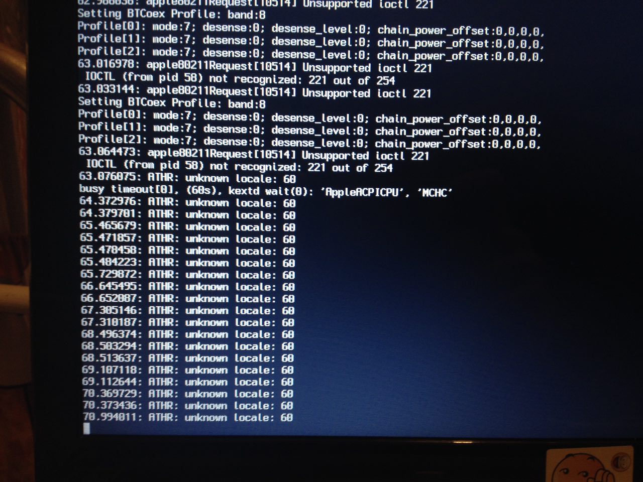 ругается на локаль, ругается на вайфай кажется, что-то с ioctl, и еще с драйверами не только на AppleACPICPU, но и MCHC через запятую указан