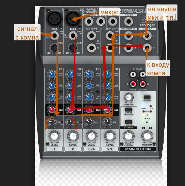 ну вот у меня звук с пк в наушники, а звук микро через фантомку в микшере и в микро-вход