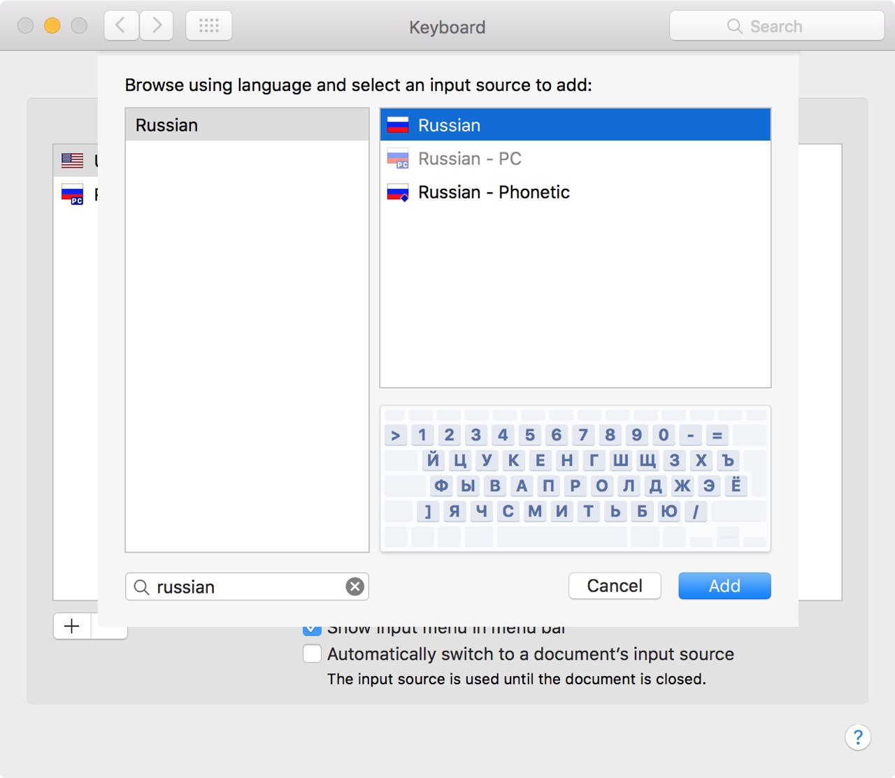 System Preferences - "Keyboard" - "Input Sources" - "Russian - PC" добавь