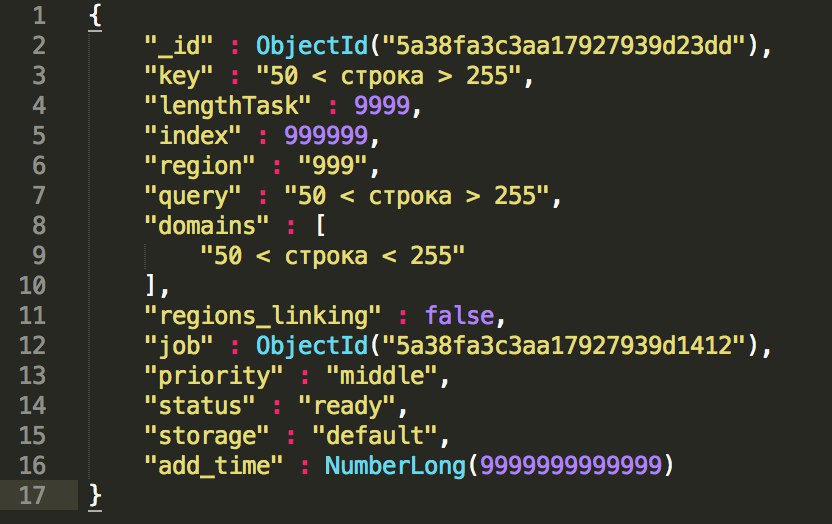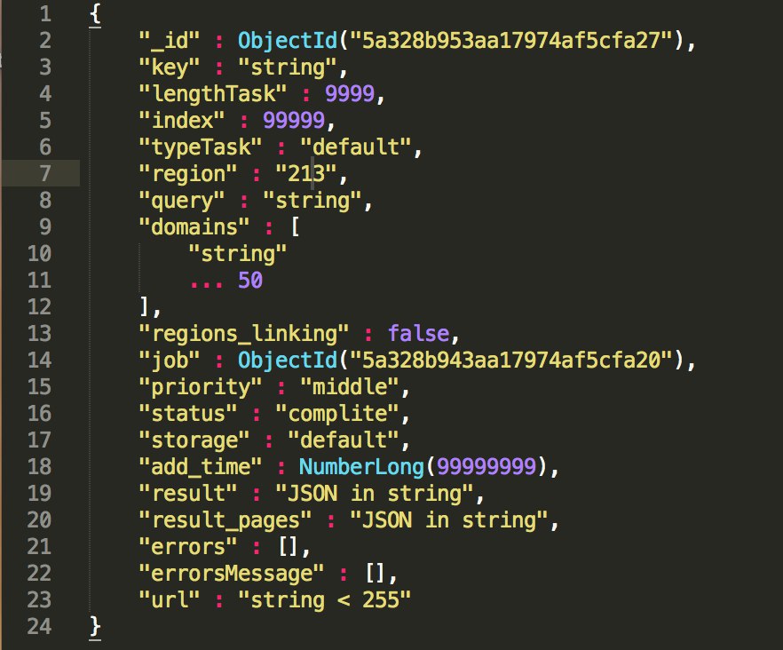 2 колекции jobs и tasks в tasks 13 полей 6 из которых текстовые, 2 хранили сериализованный json 2 ObjectId и 1 лист
