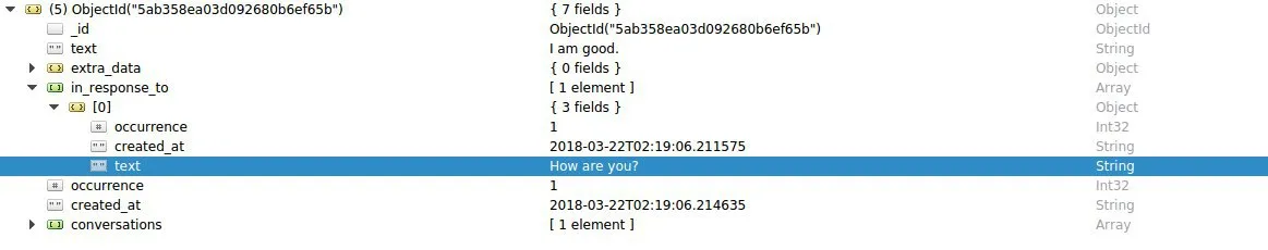 Спасибо, а можно ещё один вопрос, смотря на вторую картинку как достать in_response_to.text? .find({'text': 'I am good.'}) ,а как быть дальше?