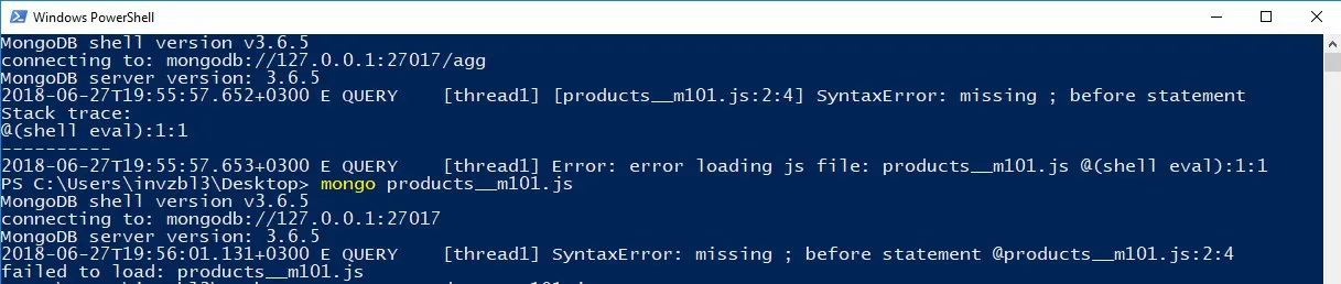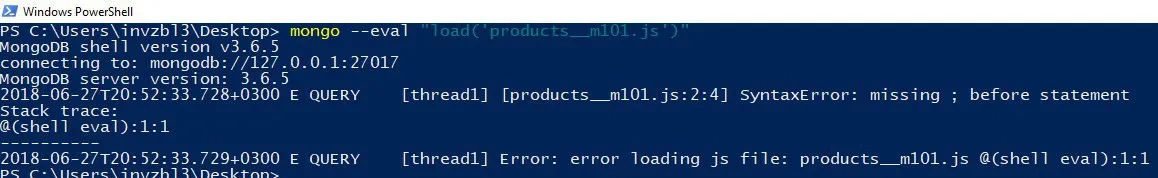 ребят, у кого-то была проблема с загрузкой данных из файла такого плана? пишу: mongo --eval "load('products__m101.js')" (файл лежит на рабочем столе)