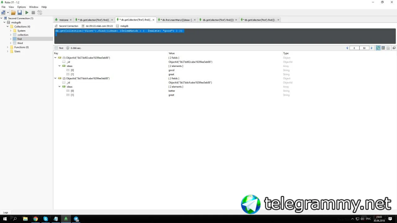 Изучаю монгу. Остваиваю $elemMatch . Мой запрос должен вывести документ, в котором в массиве есть поле "good". Почему в качестве результата еще попадает другой документ в котором такого значения нет?