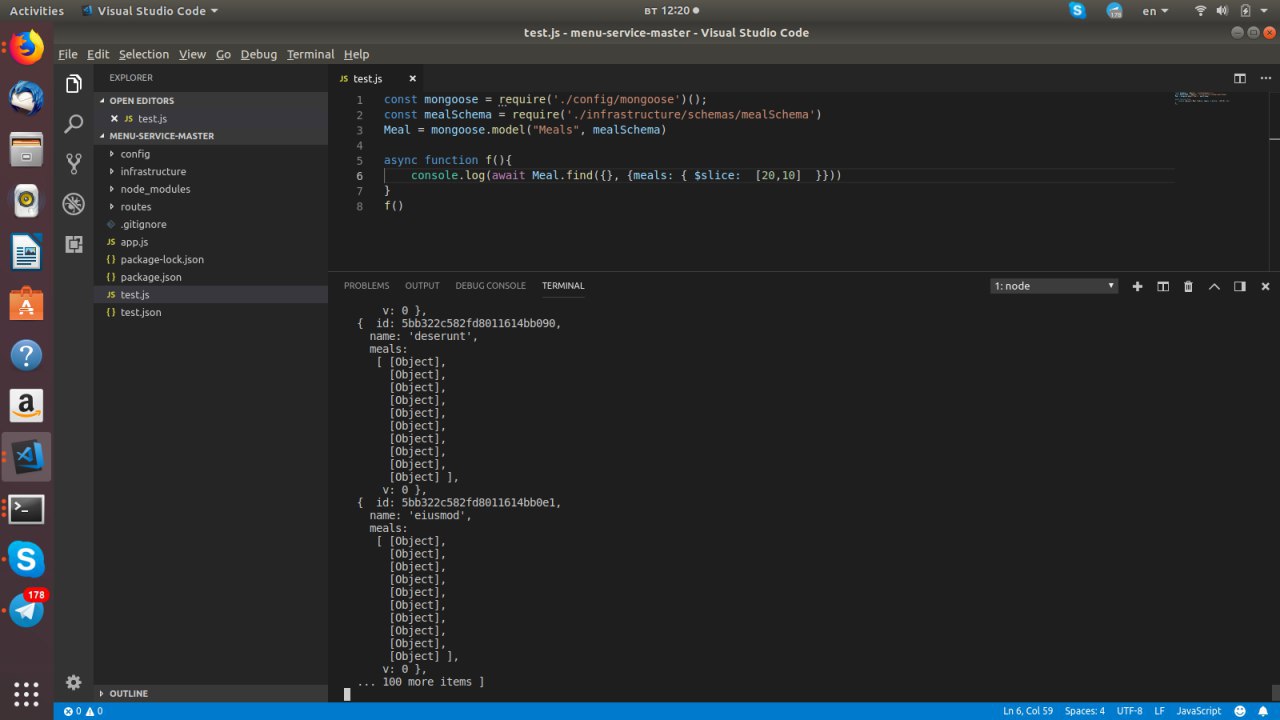 console.log(await Meal.find({},{meals: {$slice: [20, 10]}}))