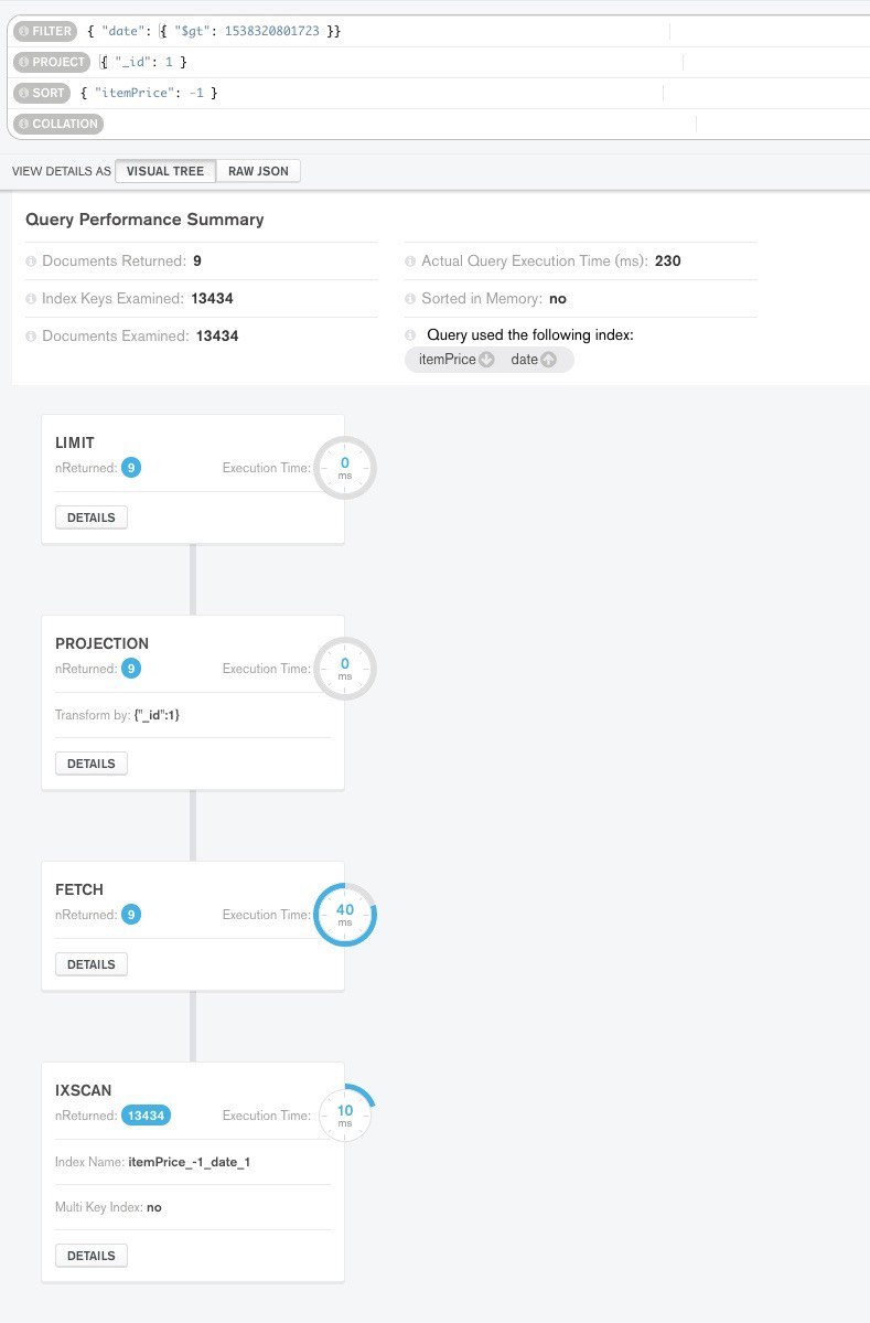 Пробовал индексы date_1_itemPrice_-1, itemPrice_-1_date_1, пробовал два отдельных индекса