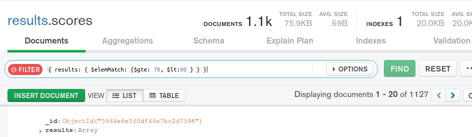 { results: { $elemMatch: {$gte: 70, $lt:80 } } }