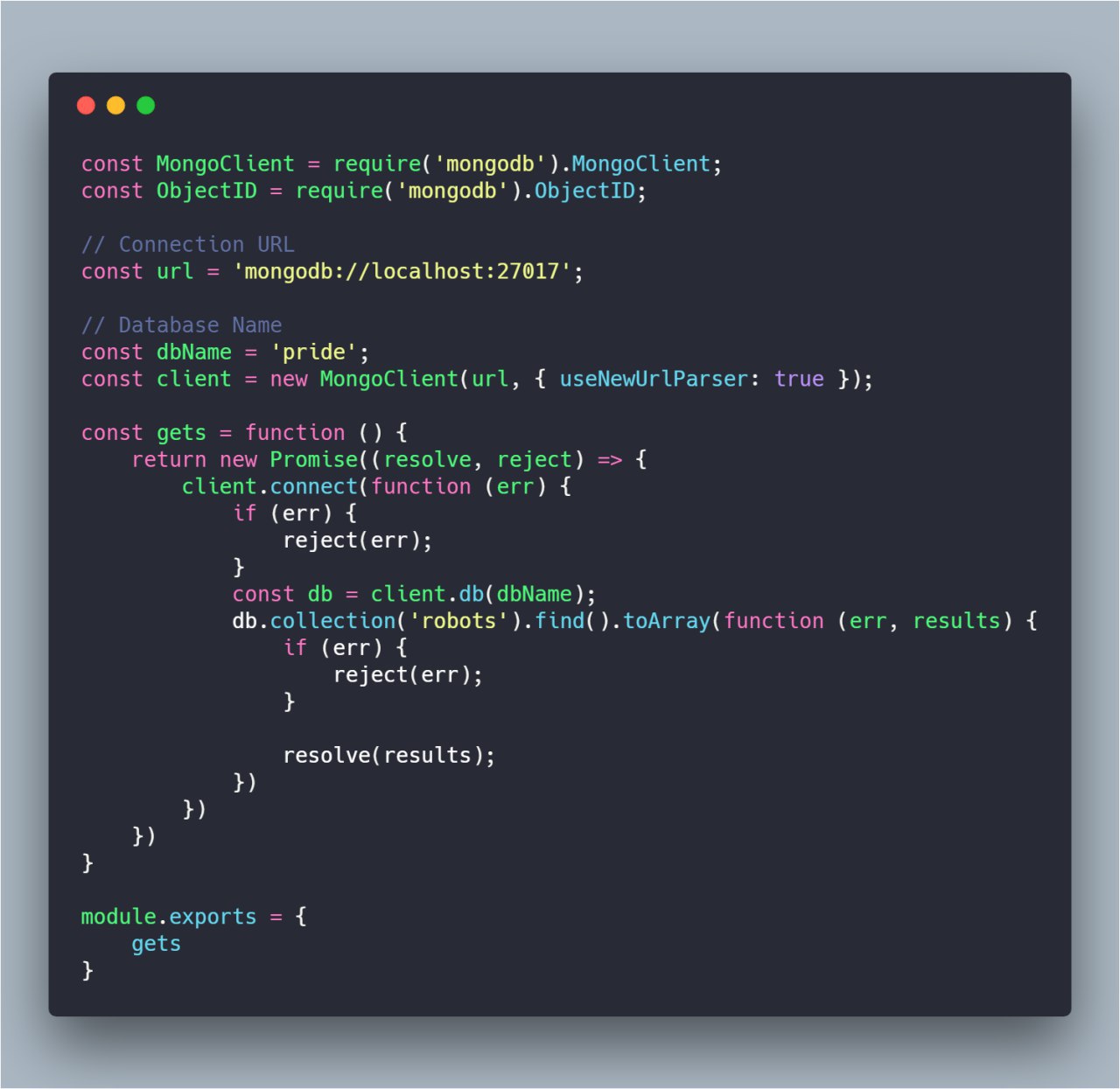 Вот посмотрите пожалуйста)) Тут у меня в файле операции с коллекцией, сверху подключение базы данных. Говорят подклчение надо вытащить в отдельный файл что именно надо вытащить?