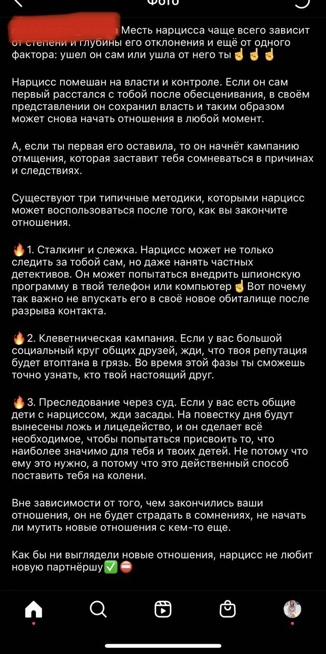 Бумеранг не прилетает, как ни странно, потому что вы ждёте, когда он прилетит. Не прилетает он туда, где сохранился поток энергии от жертвы (ну или есть новая ресурсная жертва, которую тоже сожрут потом), где она все ещё поглощена нарциссом, его действиями, его жизнью, своими обидами и так далее. Такую ситуацию очень хорошо видно, жертва, такое впечатление, живет в новой семье нарцисса, она в бесконечной борьбе, в сравнениях. Я сейчас скажу обидную вещь, но жить так - это самое легкое. Легче всего остаться в отношениях с нарциссом, пусть и так. В этом нет никакой душевной работы, можно забить на свою жизнь и опять ходить по старым паттернам. Изменять свой мозг и своё мышление огромный труд, намного сложнее физического, а преодолевать страхи это воообще тяжелейшая задача. Страхи для этого и существуют, чтобы мы от них убегали. Нарцисс строит вокруг жертвы плотный забор из этого страха, активирует все её травмы и комплексы, да, они часто иллюзорные, но она то этого не понимает, для неё они реальные. Обычно, после того как сходит газлайт, жертва понимает, что она словно была в компьютерной игре, в которой опасность была только в её воспалённом воображении, а ещё точнее, сама опасность была именно там, куда её и пытались привести страхи, обратно к нарциссу. Продолжая жить по старому, когда жизнь дала вам новые шансы. это все равно, что вы начнёте отправлять нарциссу ежедневные переводы. Да ладно деньги, это ерунда по сравнению с тем количеством энергии, здоровья, возможностей, который вы дарите человеку, разбившим жизнь вам и вашим детям. Каждый раз, когда вы заходите в соцсети, сожалеете о прошлом, вступаете в ненужные споры, мечтаете, как нарцисс повиниться, как он возместит ваши страдания, или, не дай Бог, приползёт обратно, вы относите в его дом кусочек своего счастья. Продолжайте делать это дальше, но не надо потом жаловаться, что жизнь несправедлива и бумеранга не существует.