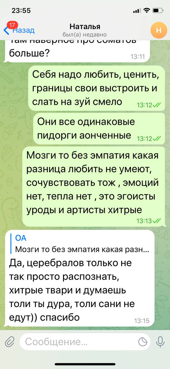 Извините , Наталья здесь 3 дня и конечно ей нужно помочь , попроще объяснять , придти в себя ! Когда жертва только начала понимать кто такой нарцисс и долго не может это принять это самое тяжелый период . И всегда где то ждёшь подножку или даже недоверие вот как бы сказала , поэтому кто вышел и уже не в абьюзе , то пожалуйста конкретней что ли пишите , чтоб до жертвы дошло , не все ведь ещё психика переварить может . 🙏🙏🙏