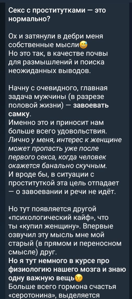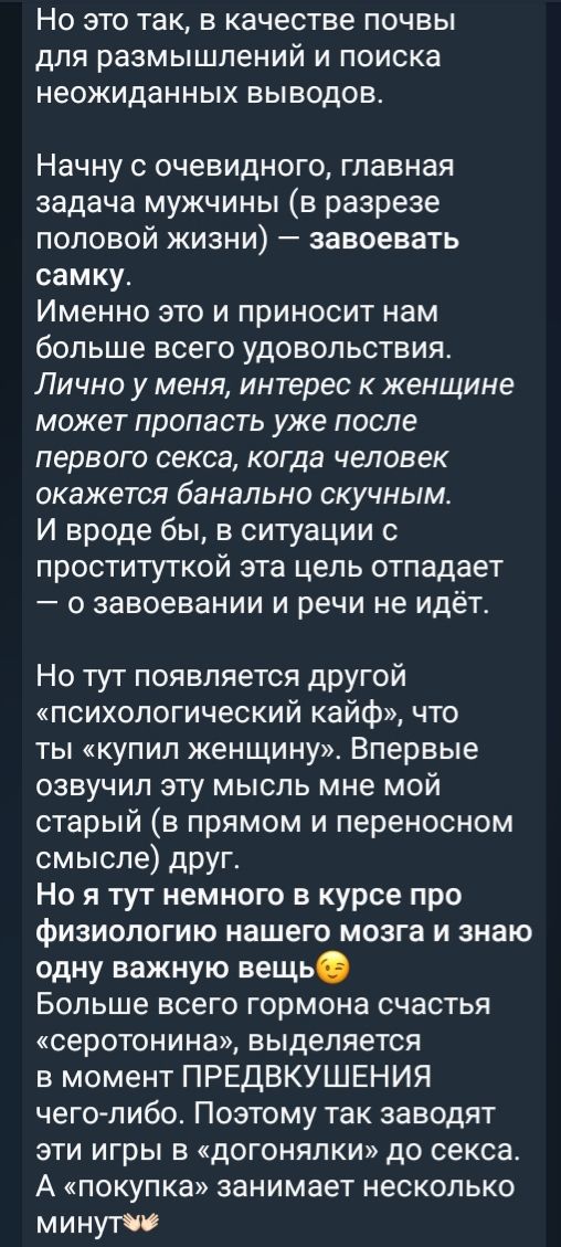 Мой говорил «сходить к проститутке-это как продолжить заниматься онанизмом»)))