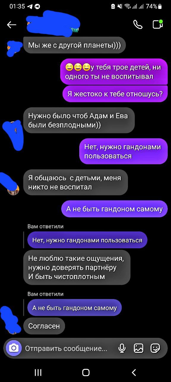 Мой сегодня обьявился, спустя 2 недели не контакта. Написал, что я бездушная по отношению к нему. Ересь такую писал, что на голову не налазит. Это у него сын родился 2 недели назад. Говорю, ты больной человек и грех вообще с тобой говорить. Он отвечает, я в Бога не верую. Дальше, слова любви от него. Говорю сыном займись то хоть, которого ты скрыл. Он: ты понимаешь, я окончательно не знал, что она беременна и что вообще ребёнок мой, я думал, что это враньё. Сын это круто, но я в шоке.Но я хотел с тобой семью. Я ему пишу: отъебись от меня. Ещё скажи, что не знаешь откуда дети берутся. Он отвечает. Ты бы меня угробила раньше морально, чем мне суждено. Я ему пишу. Ты думал, что я тебе буду лизать пятки? Ой, нет, отвечает.